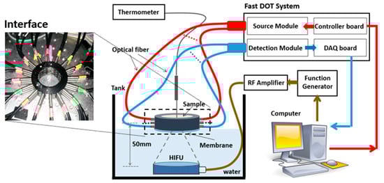 The experimental system used for this method was the same as that for DOT. Figure 1 illustrates the schematic of our fast DOT system, which was reported and described in detail previously [] (pages 7 and 8). Briefly, the light beams from forty-eight high-power NIR LEDs (Epitex, Inc., Kyoto, Japan) at a wavelength of 780 nm were delivered sequentially to forty-eight source positions on the interface via optical fiber bundles. The diffused light received by the detection fiber bundles was detected by high-sensitivity avalanche photodiodes (APDs) (Hamamatsu, El Cajon, CA, USA, C5460-01) and then collected through a data acquisition system (NI, PXI-6358). A field programmable gate array (FPGA) core board (NI, PCI-7811R) was used to control the LED timing sequence and synchronize the data acquisition of the whole system. The output power of LEDs was adjustable through a DC power supply to achieve optimal signal-to-noise ratio (SNR). The photograph inserted in Figure 1 shows the cylindrical optical fiber interface. Forty-eight optical source/detector pairs were distributed equally along the interface with an inner diameter of 4 cm. A single-element, spherically concaved HIFU transducer (H-101, Sonic Concept, Bothell, WA, USA) with a center frequency of 1.1 MHz and focal length of 5 cm was used to treat tissue samples in this study. The transducer had a 64 mm aperture and 62.4 mm radius of curvature. An electrical radiofrequency (RF) signal (sine wave: 1.1 MHz; ±10 V peak-to-peak voltage) generated by an arbitrary function generator (AFG3022B, Tektronix, Beaverton, OR, USA) was amplified by an RF power amplifier (PAB LA0005-10, Delta RF technology, Reno, NV, USA; 10 W output) and then was unitized to drive the HIFU transducer. To record the temperatures invasively, a T-type thermocouple (Omega engineering Inc., Norwalk, CO, USA, TJC36-CPSS-020G-6) with a diameter of 500 μm was inserted into the sample close to the HIFU focus point, and the measured temperature values were synchronously sent to and acquired by the computer through a USB cable. A LabVIEW program was developed to control both the DOT imaging and thermocouple measuring systems.