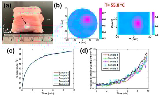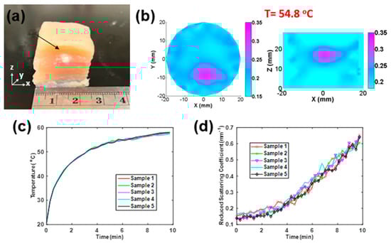 (a) Photograph of a chicken breast sample treated by HIFU along the z-axis (b) Recovered distribution in XY and YZ planes (t = 54.8 °C). (c) Temperature versus time and (d) recovered versus time of five chicken breast samples treated by HIFU in 10 min per sample.