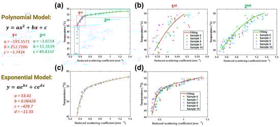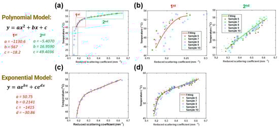 Fitting (a) polynomial model and (c) exponential model to measured DOT data of chicken breast muscle tissues. Comparison between the temperatures calculated/predicted by (b) polynomial and (d) exponential methods (solid line) and those measured by a thermometer (scattered points) as a function of .