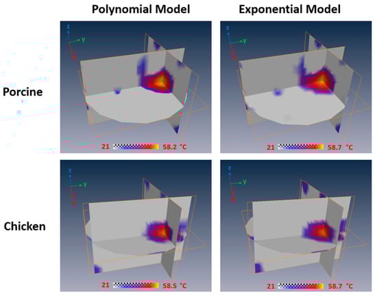 Temperature maps of porcine and chicken breast muscle at 10 min after HIFU treatment based on the polynomial model and exponential model.
