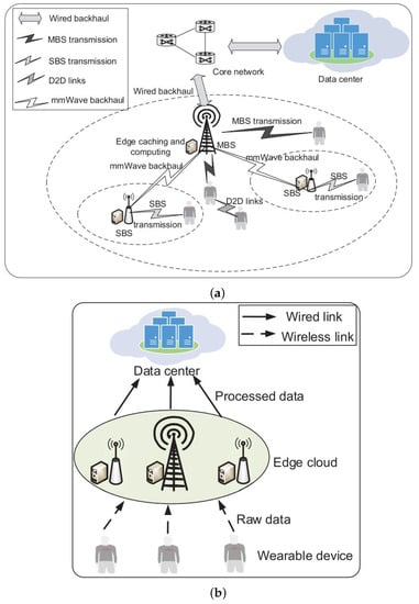 (a) The 5G ultra-dense cellular network in the wearable network macro-cell base station (MBS), small cell base station (SBS), device-to-device (D2D) (top); and (b) illustration of edge cloud and the data center (bottom) []. Reprinted/adapted with permission from Ref. []. Copyright 2022, IEEE.