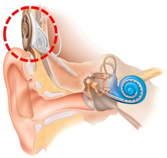 Illustration of cochlear implant (with a red dotted line) for a patient’s ears [].