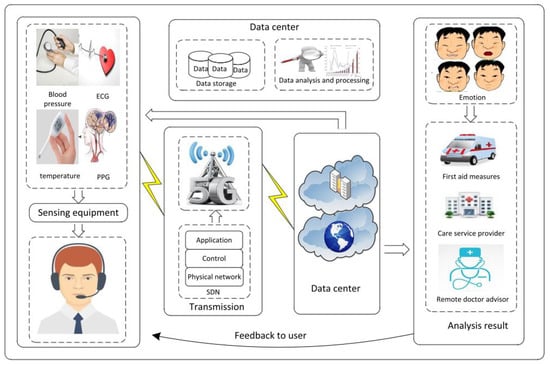 In medical applications, what is so critical and important is gathering information from massive raw data. For this case, a new system structure is presented in [] based on the emotion-aware healthcare which analyzes the relevance between emotion and sick people. Figure 6 presents the big data application in emotion-aware healthcare (BDEAH) where the 5G technology is employed into the structure and results in improved performance in whole system. As it can be noticed, the healthcare structure consists of a data center, software-defined network (SDN) components, 5G infrastructure, and sensing equipment.