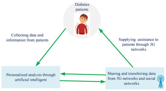 In [], another magic aspect of 5G technology toward the diabetes is illustrated. In this manuscript, Chen et al. presented a 5G-smart diabetes system that involves smart clothing, smartphone, and big data clouds. The big data is employed for sensing and collecting information that the patients are suffering from. Figure 7 shows the data sharing for 5G-smart diabetes. In this personalized analysis model, firstly the 5G network, social network, and big data network are integrated for determining the interconnection. Then, after providing related data regarding the patient, by using the artificial intelligence methods, as machine learning, deep learning, and cognitive computing, the diabetes can be predicated in a smart and accurate way.