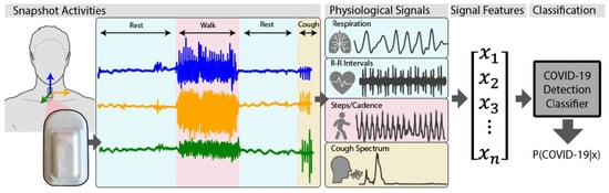 Figure 8 presents the application of wearable devices during the COVID-19 pandemic to monitor the symptoms and to pave the way for doctors to control patients’ healths over time []. L. Lonini et al. proposed a solution to detect the COVID-19 diseased state by collecting a number of physiological signals as heart activity, respiration, physical activity, and cough sounds using a body-conforming soft wearable sensor. As presented in Figure 9, by using this sensor placed on the suprasternal notch, the state of COVID-19 can be classified [].