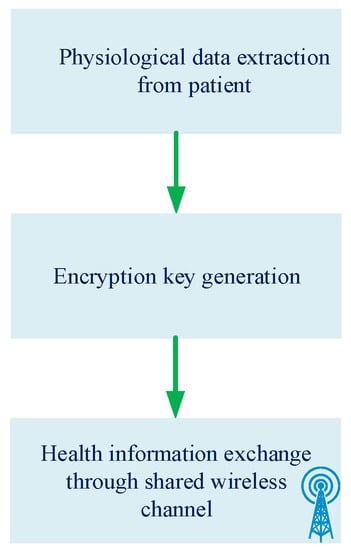 In medical applications, one of the most important factors which must be considered is the security specification and the collected data from wearable devices are sensitive and require protection []. The protection security using the heart rate pattern is depicted in Figure 10.