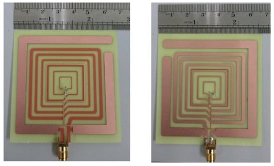 L. L. Pon et al. presented a printed spiral resonator that is without external lumped elements and it is appropriate to be used in biomedical devices []. Figure 11 illustrates the fabricated printed spiral on the FR-4 substrate with the dielectric constant of 4.7 and a size of 66 mm × 70 mm × 0.4 mm. The measured maximum power transfer efficiency (PTE) is 74.96% and PTE is more than 70% for all rotational angles from −180° until 180° at the central frequency of 13.56 (MHz).