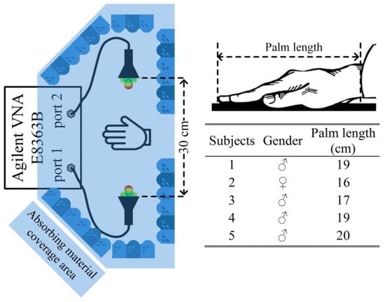 N. Zhao et al. presented the procedure of characterizing the hand palm local channel at mm-Wave frequency bands of 27–28 GHz, 29–30 GHz, and 31–32 GHz, []. This study guides the handheld application developers and will develop low-power wireless sensors for medical and wearable devices. Figure 12 illustrates the hand palm local feature presented in [], wherein two horn antennas and five human features are different in palm lengths. This design will help antenna designers obtain suitable efficiency in out of body-centric communication systems.