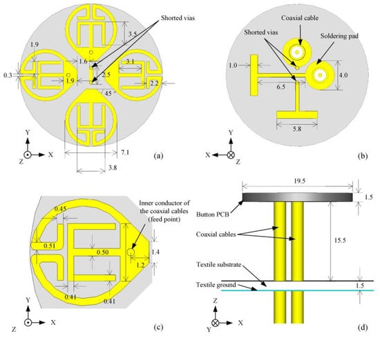 Illustration of the wearable button antenna. Reprinted/adapted with permission from Ref. []: Copyright 2022, IEEE. (a) top view; (b) bottom view; (c) radiator structure; and (d) side view.