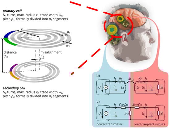 In [], geometrical coil optimization was performed, which is employed for optimizing planar spiral coils with integrated capacitive elements for enhancing the power transfer efficiency while reducing the size of transmitter and receiver configurations. The proposed method results in a maximum efficiency of 31% with the existence of biological tissues where a 30 mm primary and a 10 mm secondary coil is sized (see Figure 18).