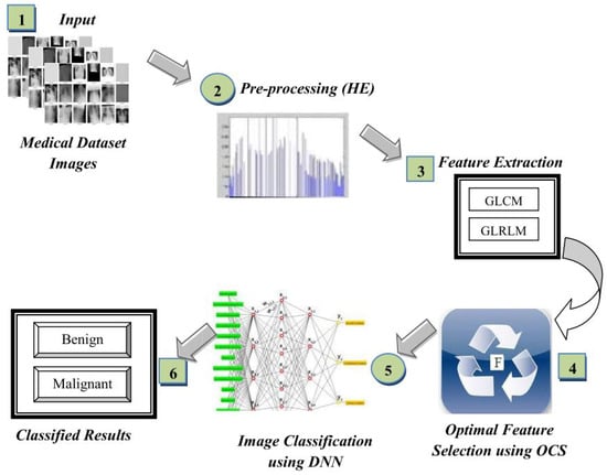 Image segmentation and classification is another promising computation in diagnosing diseases. R. J. S. Raj et al. presented the classification DNN for diagnosing lung cancer, brain image, and Alzheimer’s diseases []. The opposition-based crow search (OCS) algorithm was employed to enhance the performance of the DNN, leading an optimal feature selection being derived. Figure 21 illustrates the flowchart of the presented classification DNN resulting in an accuracy of 95.22%, a sensitivity of 86.45%, and a specificity of 100% for the used medical images.
