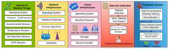 - Khan, M.A.; Algarni, F. A Healthcare Monitoring System for the Diagnosis of Heart Disease in the IoMT Cloud Environment Using MSSO-ANFIS. IEEE Access 2020, 8, 122259–122269. [Google Scholar] [CrossRef]
