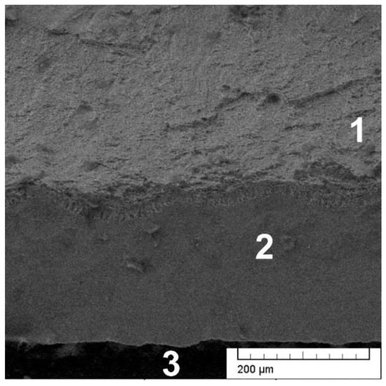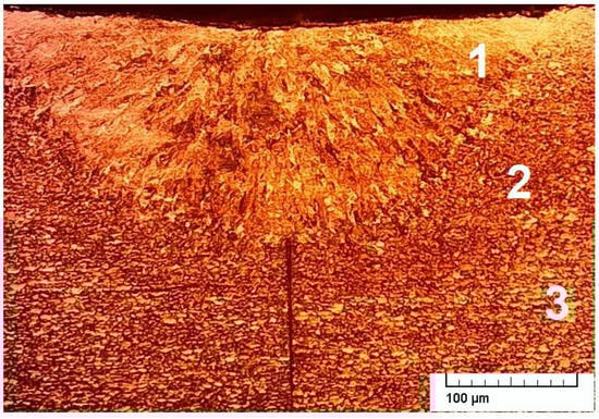 Typical cross-section of the laser butt welding zone of the upper layer of a steel–polymer three-layer composite sample at a pulse duration of 1 ms: 1—remelted zone with a developed interdendrite microheterogeneity; 2—heat-affected zone; 3—initial metal.