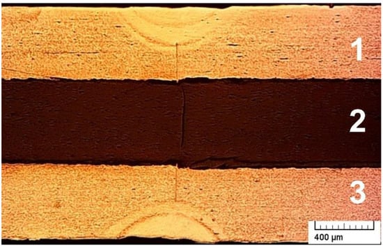 Sandwich panels are promising composite materials, combining the advantages that mono-materials often cannot offer, such as high bending resistance, good energy absorption, as well as high load-carrying capacity combined with low specific weight [,,]. However, the possibilities for thermal joining for producing long-length tailor-made multilayer composite components based on polymers, e.g., for the automotive industry, are limited due to the instability of the polymer core at elevated temperatures. The degradation of the polymer during the welding of cover metal sheets leads not only to corrosive effects that should be avoided []. High temperature can negatively affect the properties of the central layer and lead to a significant local deterioration in the damping and acoustic properties of the sandwich material. In Refs. [,], laser welding was proposed as a technique for accomplishing the task of joining such parts. A two-sided welding scheme, whereby the sandwich material must be welded on both sides to completely eliminate or significantly reduce the thermal impact on the polymer core, was recommended in [,]. However, these Refs. [,,,] describe the results of one-sided welding only, whereby it was not possible to obtain a weld without completely removing the polymer layer. Considering the results of these studies, it was reported in [] that laser welding cannot be applied to multilayer materials without damaging the central polymer layer.