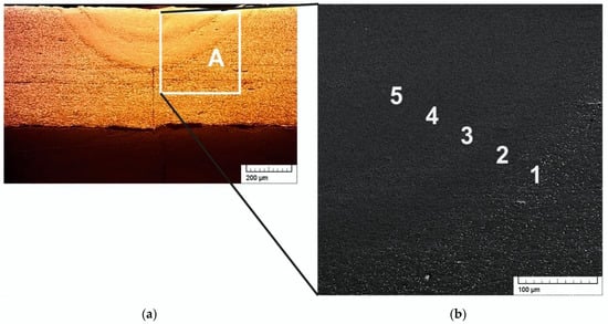 (a) Microsection of the welded joint in the upper layer of the MPM sample, registered using a Neophot-30 microscope. To enhance the contrast in the surface image of the microstructure an oblique illumination was used; (b) cross-section of part A of the heat-affected zone recorded using a VEGA\SB, Tescan SEM: 1—the base metal; 2, 3—the heat-affected zone; 4, 5—the welded metal.