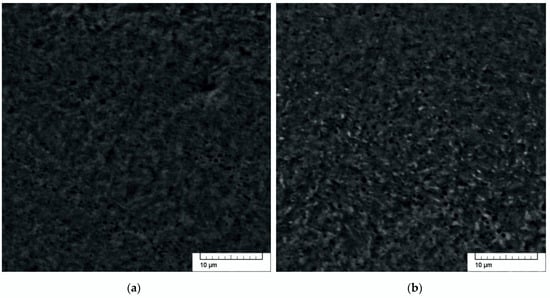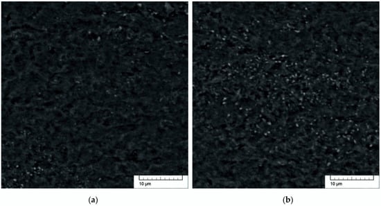 When remelting regimes are used, the recrystallisation of the grain takes place, as a result of high-temperature heating. The characteristic initial structure of the steel disappears completely. After several cycles of melting and crystallisation, a finely dispersed structure of low-carbon martensite forms in the weld (region 4 in Figure 4 and Figure 7a). It represents the result of multiple rapid remelting and solidification in the areas where the laser spots overlap. This structure is formed as a result of a relatively rapid cooling into the depth of the material. The lighter regions in Figure 7b (region 5 in Figure 4) also represent small grains of formed ferrite. The formation of the described metallic structures in the heat-affected and remelting zones during laser treatment can be explained by the difference in the parameters of the ongoing thermal cycles of heating and cooling. It is known that the value of cooling rate is related to the size of the cast zone and, thus, depends on the welding conditions. As the volume of the weld pool increases, the cooling rate in the remelted zone and the rate of crystallization decrease. Dendritic structures with developed interdendritic microheterogeneity are not observed in the melt pool.