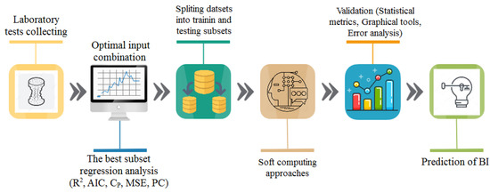 Best feature selection is one of the most crucial stages for building a predictive model based on a data-driven model; it has a key role in the accuracy and reliability of developed models. Best subsect regression analysis [38] is one of the most popular schemes for identifying the best input features based on linear regression modeling. In this approach, six metrics (mean square error (MSE), correlation coefficient (R), adjusted R2, Mallows coefficient (Cp) [39], Akaike (AIC) [40], and Amemiya (PC) [41]) have been computed for choosing the best input combination [38] (see Table 2). The possible tree combination demonstrates that the last case includes all input parameters and has the highest R2 (0.817) and lowest Mallows, Akaike, and Amemiya (MSE = 0.463, Cp = 5 AIC = −60.552, and PC = 0.21); as such, this case can be identified as the best combination for modeling BI. Thus, the functional relationship between the chosen features and target can be expressed as follows: