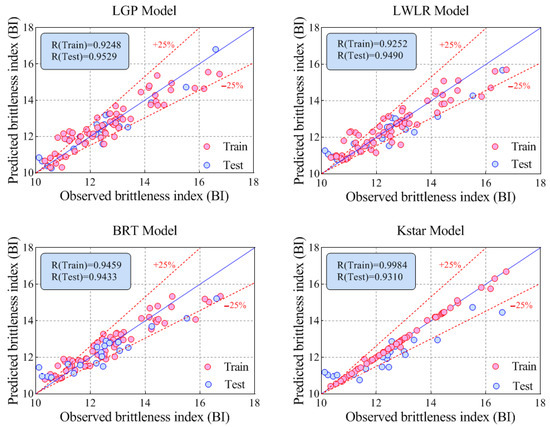 - Among the proposed models, the KStar (R = 0.9984 and RMSE = 0.0865) model predicted BI with the best performance in the training phase, while the best performance for the testing phase was achieved by the LGP (R = 0.9529 and RMSE = 0.4838) model. In addition, both LWLR (R = 0.9490 and RMSE = 0.6607) and BRT (R = 0.9433 and RMSE = 0.6875), ranking second and third, respectively, lead to desired results for modeling BI values.