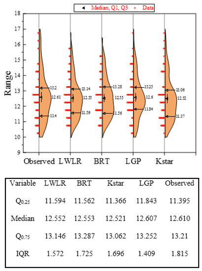 In the next graphical validation stage, half violin plots for all datasets are featured to show the distribution of quantitative data across several predicted values levels compared to observed ones. The underlying distribution of the models has been estimated using a smooth kernel density function by showing attractive benchmark points, namely the median and quartiles depicted in Figure 8. It is abundantly clear that KStar and BRT have closer Q25% values (11.366 and 11.562, respectively) to the observed values (11.395) compared with the LWLR and LGP approaches, whereas the LGP and LWLR Q75% values (13.251 and 13.146, respectively) exhibit better agreement with the observed values (13.21). Given the arrangement of the datasets, it is evident that the first Q25% is filled into the training data. Regarding KStar, the remarkable performance in training and disappointment in the testing phase implies that overfitting occurred in this paradigm.