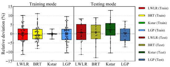 Box plots for the relative deviation (%) distribution of all predictive models in testing and training.