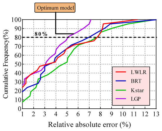 The cumulative frequency percentage versus the relative absolute error (%) for LWLR, BRT, KStar, and LGP models for the testing dataset.