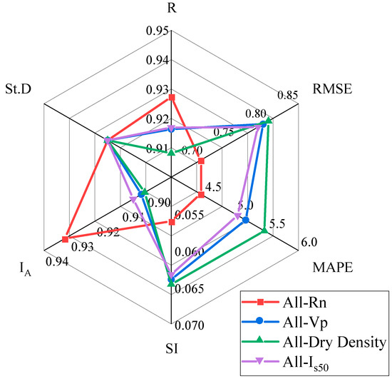 For more effective use of the AI methods, recognizing the effective parameters is an essential issue. One of the most widely used techniques for sensitivity analysis (SA) is consecutive elimination of the input variables and executing the AI model for all created situations. This research used the LGP model as the best model to implement the SA. Table 5 lists the SA results for five modes of combining inputs. The results demonstrate that Dry Density, with the lowest R (0.9081) and highest RMSE (0.8027) and MAPE (5.4642), is the most efficient input variable to estimate the brittleness index (BI). In addition, the Vp (R = 0.9163 and RMSE = 0.7944) ranks second, followed by Is50 (R = 0.9169 and RMSE = 0.7861) and Rn (R = 0.9273 and RMSE = 0.6959). A spider plot based on the six statistical criteria for all combining inputs is displayed in Figure 12. According to this figure, the combination with eliminating the dry density variable (i.e., all-dry density), showing the lowest R and IA and highest RMSE and MAPE, has the greatest impact on the accuracy of predicting BI. It should be mentioned that some feature selection methods such as Boruta-random forest can be utilized to specify the influential parameters, which has great ability to capture the non-linear interaction between the predictors and target. This aim can be considered as an alternative of classical sensitivity analysis.