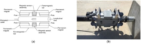 Magnetic flux leakage methods include two major categories: active magnetic flux leakage and residual magnetic flux leakage. A portable magnet is used to submit a ferrous material/steel to a high magnetic field in the active magnetic flux leakage technique. This creates flux routes between the two poles of the material. The magnetic field in the material “leaks” from its regular path of least resistance to spots where there is a section loss. The leak is detected using a magnetic field detector (made up of Hall-effect sensors) placed between the magnet’s poles and is sensitive to the change in the magnetic field. The residual approach involves bringing the steel to full magnetic saturation to erase its unknown magnetic history, then removing the magnet and passing the sensors over the portion to detect the remaining magnetic field [53,54]. Figure 7 [9] shows the schematic of the sensor probe, full head sensor, half head sensor, and the connection of the NDE extension to the computer.