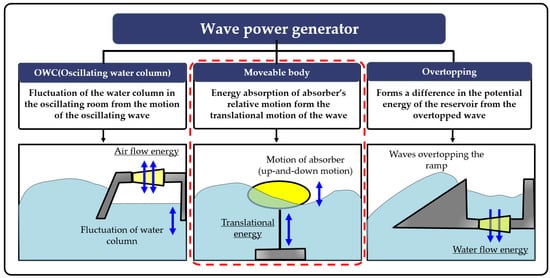 The primary energy conversion is classified according to differences in the method of absorbing wave energy such as rotational displacement, horizontal or vertical displacement when absorbing energy from waves. Representatively, there are oscillating water column (OWC), overtopping, and movable object type wave power generators according to the primary energy conversion method as shown in Figure 1. Among them, the movable object type wave power generator is very advantageous in terms of energy-absorbing efficiency because wave energy directly affects the floating body. In addition, the point absorber wave power generator having a smaller floating body size than the wavelength is advantageous for applying to multiple generations using the same sized structures or installing in parallel with other energy sources. Therefore, many studies have been conducted recently.