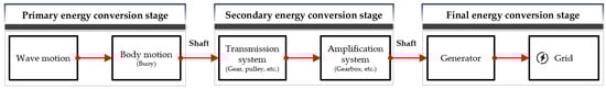 The whole process of energy conversion of primary energy conversion, secondary energy conversion, and final energy conversion through movable object type wave power generators can be expressed as shown in Figure 2. In the primary energy conversion, the vertical or horizontal reciprocating motion of the waves is transferred to the vertical or horizontal reciprocating motion of the floating body. In the second energy conversion, this motion is transmitted to a rotational motion using mechanical systems such as gears, pulleys, gearboxes, or hydraulic system elements such as hydraulic cylinders, hydraulic pumps, and hydraulic motors. This rotational motion is transmitted through the shaft to drive a generator. In the final energy conversion, this motion is converted into electrical energy through a generator.