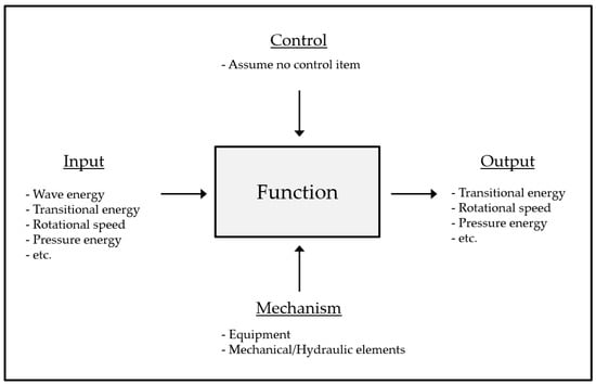 For the conceptual design of the secondary energy conversion systems, based on the system analysis of representative types of the movable object type wave power generator performed in the previous section, in this section, the energy conversion type of the system is expressed and generalized by IDEF0 modeling method. It is shown in Figure 4.