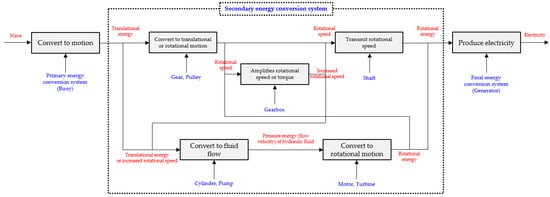 Through the functional analysis using the IDEF0 method in the previous section, the necessary equipment for performing each function was derived. According to the function of the derived equipment, the gear or pulley of the mechanical system is in charge of translation of translational or rotational motion, the gearbox amplifies the number of revolutions using the gear ratio, and the shaft is responsible for the transmission function of the rotation axis. The hydraulic system is also responsible for converting translational motion using a cylinder and generating rotational energy using a motor or turbine. Accordingly, in this section, based on the logic of secondary energy conversion, secondary energy conversion systems are constructed as an appropriate combination of each derived equipment.