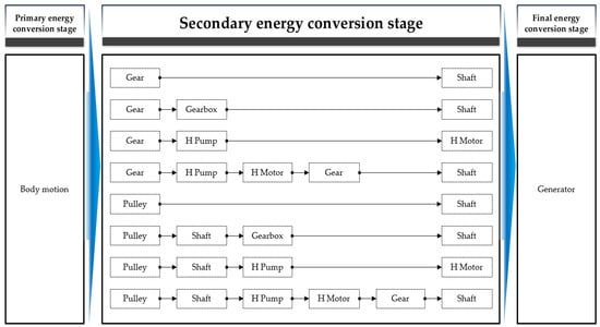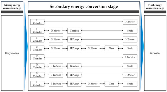 Therefore, the case of each representative secondary energy conversion system constructed by applying mechanical and hydraulic system equipment is shown in Figure 5 and Figure 6 as a process flow diagram. If the input and output components of the equipment before and after, such as Figure 5 and Figure 6, are matched, it is possible to diversify the system configuration with a combination of various equipment, but the autonomy for arrangement must be guaranteed. In this study, for the secondary energy conversion mechanical system and hydraulic system, the eight most representative PFDs were derived based on the literature review results of the existing secondary energy conversion system. More various PFDs can be derived, but in general, the more the equipment of the system, the lower the efficiency. Therefore, the PFD according to the combination of more equipment was not derived in this study.