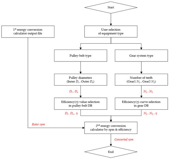 The algorithm for assessing the reliability of the secondary energy conversion using the DB and formula of the gear and pulley built in the previous section is shown in Figure 7. As in the algorithm, according to the type and specifications of the equipment, the corresponding efficiency DB and formula were constructed. Accordingly, the RPM generated by the primary energy conversion is the input to the secondary energy conversion formula, and the RPM by the secondary energy conversion is the output.