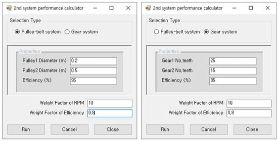 The graphical user interface (GUI) of the reliability assessment program developed by applying the efficiency DB based on the commercial products according to the algorithm is shown in Figure 8. For example, if the gear and pulley systems are selected, and the transmission efficiency and basic properties of the selected system are input, the efficiency and RPM are derived using the built-in performance formula. On the GUI, the weight factor of RPM () is a factor that applies the amount of change in RPM when there is an RPM converter such as a pump or gearbox system, not a gear or pulley system. In addition, the weight factor of efficiency () is a factor that applies the efficiency change when there is an efficiency converter other than a gear and pulley system. Weight factor is used to account for the variation in each stage when assessing the reliability of the multi-stage system. Finally, using the reliability assessment program developed in this study, the performances of each type of equipment that make up the system are derived, and the guideline can be presented when designing the model. In the future, through the continuous update of the program, the reliability assessment algorithm of all other equipment included in the secondary energy conversion system of the wave power generator will be included, and the DB of other equipment will be additionally secured. Accordingly, it will be used as the basis for the development of the secondary energy conversion system of the actual wave power system.