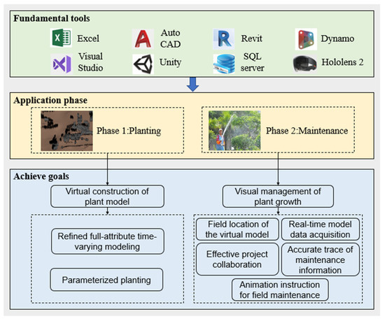 Typical landscapes usually require adequate planting and maintenance (P&M) of a huge number of plants with various types. Construction and management of such a huge landscape area requires extensive manpower and experienced staff to plant and maintain all plants within the landscape. Existing landscape engineers and management staff do not yet have profound knowledge and experience for adequate P&M during construction and maintenance stages of landscapes. Human errors occur frequently and cause inappropriate P&M of plants [1]. Moreover, timely capturing detailed spatiotemporal changes of various plants within the landscape is difficult and time-consuming due to the changing environment of the four seasons [2]. The way in which to achieve intelligent construction and management during tedious P&M processes of a huge number of plants is essential to ensure the sustainable development of landscapes. Creating precise digital representations of various plants and achieving real-time collaborations using building information modeling (BIM) techniques has thus become factorable by landscape architects and engineers [3,4]. To achieve such a vision, it is therefore necessary to (1) establish detailed models of various plants for virtual construction, (2) capture spatiotemporal changes of plants across four seasons for model updating, (3) allow real-time data transmission for effective project coordination, and (4) achieve remote maintenance of various on-site plants for intelligent construction and management of landscapes.
