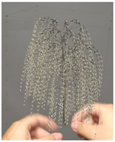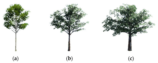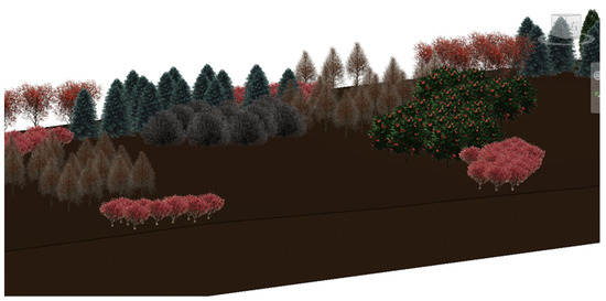 Creating better plant visualization of the model is important for landscape design and construction. Establishing a fine tree model is thus necessary to enhance the realism of the virtual landscape. Due to the complex interdependence between plants and the environment, modelers should pay more attention to capturing changes in plant appearance and morphology with tree age, seasons, and other factors [27]. Modelers use Revit to finely create the full attribute of the model, create a static plant library, and assign different growth states to plants, so as to realize the time-varying driving of static attributes and dynamic attributes of the plant model. Such efforts could help to promote the periodic update of the model data information and improve the authenticity of the model simulation effect.