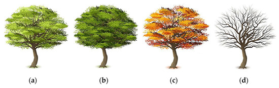 Representations of plants within four seasons: (a) spring; (b) summer; (c) fall; (d) winter.