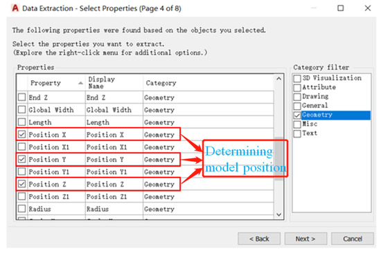 Designers use the built-in “data extraction” function in AutoCAD software (as shown in Figure 4) to extract the data information (e.g., block attributes, graphic features, positions) of the plant objects in the design drawings into an Excel spreadsheet. Then, the data in the table and the table styles are further processed to pave the way for the precise positioning and batch planting of subsequent models. The designers can organize and optimize the information in the table or format an existing table as a template through a specified table style. When the data change, the extracted data can also be automatically updated to keep pace with the data source. After the designers are satisfied with the form, the data extraction process is completed. If they need to share the extracted information with others in the project, they can output the same extracted data to an external file.