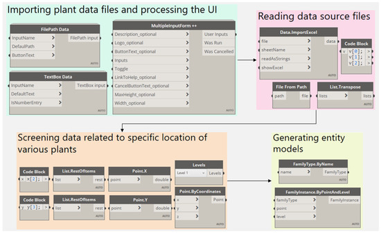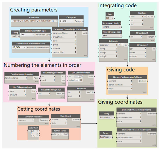 Dynamo is a graphical programming plug-in for custom building information workflow based on Revit [28]. Converting the Excel data exported and processed by CAD into the data in Dynamo in the script. The “Data. Import Excel” node is used to read all plants in the Excel table to realize the precise positioning of the plant model. Finally, the model is transferred to Revit through the “Family Instance. By Point And Level” node, as shown in Figure 5. The batch creation of different types of plant models can be realized. Similarly, the “Select Parameter Type”, “Parameter. Create Project Parameter”, and other nodes are used to create the required parameters in the script. The elements are numbered in the order from north to south and from west to east, and model coordinates are obtained in the order of numbers. At the same time, the coding is integrated, and the coding is given to the model. Finally, the coordinate position of the model is assigned by combining the coding and the obtained coordinates, as shown in Figure 6.