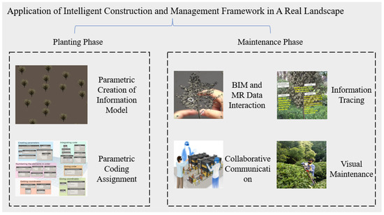 This study proposed a framework for intelligent construction and management of landscapes for ensuring adequate construction and maintenance of landscapes. The proposed framework contains two parts: (1) virtual construction of plant model, and (2) visual management of plant growth (see Figure 1). We used BIM to establish detailed digital representations of various plants within the landscape. The established digital representations could represent multivariate plant-related construction information (e.g., attributes, position). On the other hand, the proposed method allows users to visualize the real-time plant condition through a MR device. Moreover, the unique characteristics of the time, space, and information expression of various plants could be visualized in the environment combining the virtual world and reality. Thus, the proposed framework could be helpful in improving (1) project coordination and (2) the traceability of plant maintenance information for achieving scientific and effective landscape management.