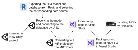 We parsed, extracted, assembled, and encapsulated the plant model data designed in Revit and exported the model and ODBC database. After importing the model data to the database server, an information management platform based on BIM and MR could be constructed on the basis of the Hololens2 device. We debugged and integrated the platform environment in the visual management database, accurately matching the data, indexing each other, and forming the overall model. Then, the digital display and interaction of the plant information model in the virtual and reality coexisting environment was able to be realized. The specific operation process is shown in Figure 11 below.