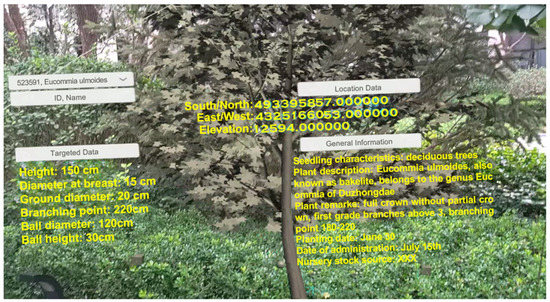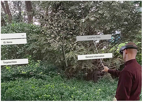 The authors transferred the BIM data to the Hololens2 device. Then, the device was used to place the same proportion of BIM models in the physical space. Subsequently, we were able to retrieve relevant plant information (e.g., ID, name, location, height, diameter at breast) at any time on the site for effective management of various plants. Data in the BIM model were visualized to improve the data transmission efficiency between the model and the site, as shown in Figure 12.