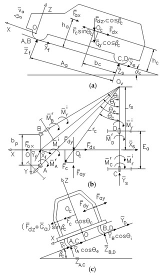 - Tangential reactions at the drive (motor) axle (XA, XB), as ground adhesion forces, or at the non-motor axle (XC, XD), as ground friction forces:or when braking:where Ψa is the adhesion coefficient [28] and fr is the rolling resistance coefficient [29];