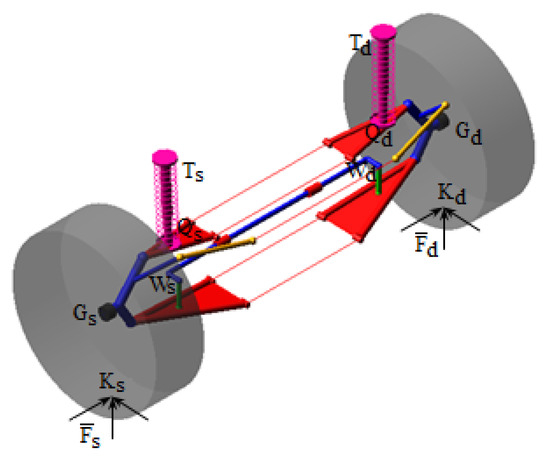 The external loading of the suspension system is carried out by forces applied to the wheels (Fs,d), in the theoretical contact point with the ground (Ks,d), corresponding to the specific operating regime (such as stationary, traction, braking, skidding). These are balanced by the reaction forces or torques in the elastic elements of the suspension system, as follows: