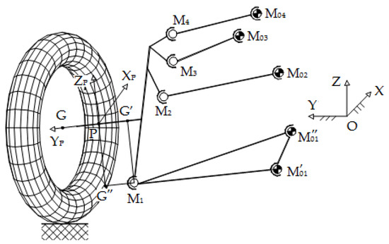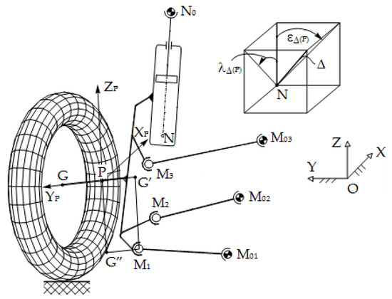 The current spatial position and orientation of the wheel, relative to the global reference frame attached to the car body (OXYZ), is completely determined by three non-collinear characteristic points (see Figure 4): the center G of the wheel (Gs/d for the left/right wheel), and the projections G′, G″ of the lower guidance point M1 on the transverse and vertical axes of the wheel carrier reference frame (PXPYPZP).