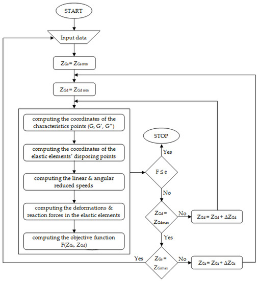 By algorithmizing the above presented method, a computer program was conceived using Borland Delphi. The logical block diagram of the process of finding the static equilibrium position is presented in Figure 6, corresponding to the general case in which the contact forces on the left and right wheels are not equal, so there is an elastic reaction in the anti-roll bar. Appropriate customizations can also be used to define the logical block diagram for the (simpler) case in which the anti-roll bar does not operate, so only one generalized coordinate (ZGs or ZGd, by case) is involved in the iterative process.