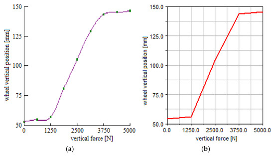 For a supplementary validation of the method and the computer program developed based on it, the static model of the wheel suspension system was modeled and analyzed using the MBS (Multi-Body Systems) software environment ADAMS. The comparative analysis between the two models was performed by considering the stationary loading regime, in which the external action was carried out by applying equal vertical forces to the wheels in the range (0, 5000) N while the longitudinal and transversal forces are null, thus simulating the whole (extension–compression) vertical motion range of the wheels. This is actually a quasi-static analysis, which is defined by a series of successive static analyses with different forces applied to the wheels in the mentioned value range. According to the charts shown in Figure 8, the results from the proposed mathematical model have a very good match with the results from ADAMS, which ensures the reciprocal validation of the two models/methods. The small differences in the lower and upper buffer zones are mainly due to the way the curves are drawn in the two programs.