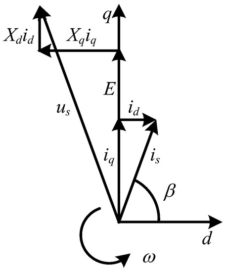 The voltage–current vector relationship is displayed in Figure 2, where us is the vector resultant of voltage components in a d-q synchronous rotating coordinate system, is is the vector resultant of current components in a d-q synchronous rotating coordinate system.