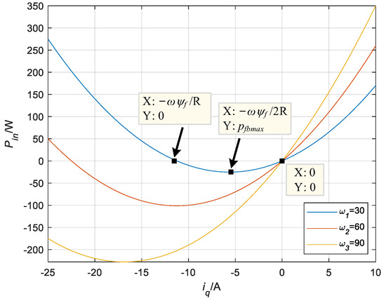 In the figure, the positive direction of iq is its direction in the motor drive state. Let Pin = 0 to obtain two zeros of Pin(iq) at iq = −ωψf/R and iq = 0. When iq < −ωψf/R, Pin > 0. At this stage, the braking requires a positive input power, which indicates that the motor functions in the state of energy consumption braking. When −ωψf/R < iq < 0, Pin < 0. At this stage, the input power is negative, which indicates that the motor operates in the energy feedback braking state. When iq = −ωψf/2R, a minimum value exists in Pin(iq), indicating that the energy feedback of motor braking has a maximum value.