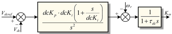 Based on the aforementioned analysis of the braking state and the power model, an energy feedback control method was proposed to improve EDLSS stability caused by the braking state of the loading motor, as displayed in Figure 5. In the figure, dcKp and dcKi are the proportional and the integral coefficients of the energy feedback proportional integral (PI) controller; ωr is the angular velocity of the motor rotor; τdc is the time constant of the filter; Kω is the regenerative braking factor, which can be expressed as follows: